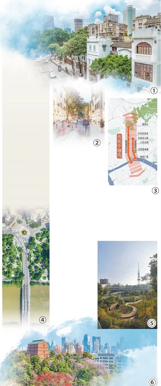 圖①:廣州市越秀區(qū)起義路街景。圖②:廣州市越秀區(qū)北京路步行街。圖③:廣州傳統(tǒng)中軸線示意圖。圖④:廣州市越秀區(qū)海珠廣場鳥瞰圖。黃 劍攝(人民視覺)圖⑤:廣州“云道”越秀山段。圖⑥:廣州市越秀區(qū)越秀山鎮(zhèn)海樓。圖①②③⑤⑥均為廣州市規(guī)劃和自然資源局提供