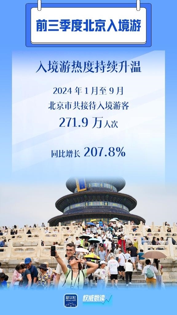 隨著中國免簽“朋友圈”持續(xù)擴(kuò)容、便利人員往來措施不斷優(yōu)化,北京入境游市場加快恢復(fù)。北京市文化和旅游局日前發(fā)布數(shù)據(jù)顯示,2024年1月至9月,北京共接待入境游客271.9萬人次,同比增長207.8%。從單月恢復(fù)情況看,5月以來市場恢復(fù)速度加快,9月為年初以來的峰值,入境游客達(dá)38.4萬人次,增長趨勢(shì)明顯,正逐步接近2019年同期水平。