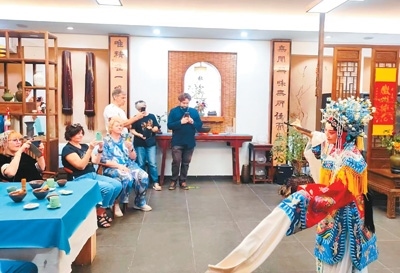 外國游客在黃山屯蒙學舍體驗徽劇文化。