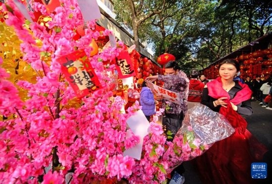 隨著春節(jié)的臨近,廣西南寧市交易場(chǎng)附近的新春飾品攤位生意日益紅火,眾多市民前來(lái)采購(gòu)春聯(lián)、窗花等新春飾品。