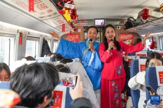 春運(yùn)前夕,中國(guó)鐵路上海局集團(tuán)有限公司合肥客運(yùn)段組織由鐵路職工組成的非遺表演小分隊(duì)登上C3685次旅客列車,為車廂內(nèi)的旅客帶來(lái)“廬州蛋雕”和黃梅戲表演等,并為旅客送上祝福。