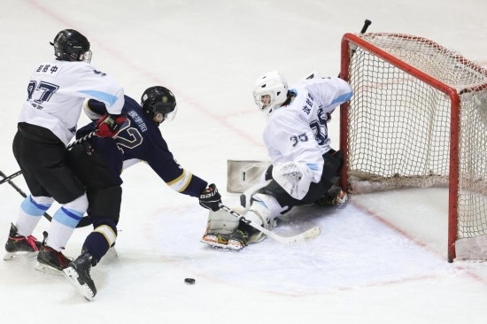 2024年12月8日,北京京獅男子冰球隊(duì)球員侯宇陽(中)在2024-2025賽季中國(guó)男子冰球職業(yè)聯(lián)賽(齊齊哈爾站)比賽中射門。新華社記者 張濤 攝