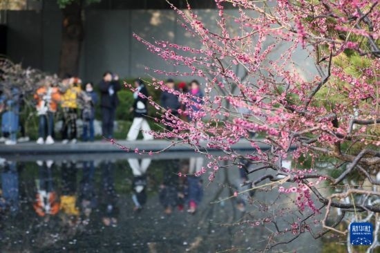 3月8日,人們在上海靜安雕塑公園觀賞梅花。