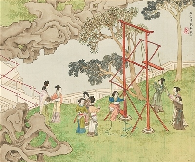 秋千,古稱“千秋”,可追溯至春秋時期,后改為“秋千”。據(jù)《荊楚歲時記》記載:“春時懸長繩于高木,士女衣彩服坐于其上而推引之,名曰打秋千。”在古代,清明節(jié)更是有著秋千節(jié)的別稱,可見古人對春日蕩秋千的喜愛。
