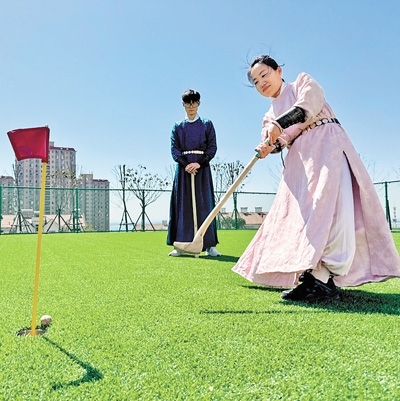 瞄球、揮擊,隨著一聲清脆的擊打聲,陶瓷小球劃出優(yōu)美的弧線,停到插有旗桿的“球窩”附近。春日遲遲,在河南省平頂山學(xué)院捶丸球場,一群學(xué)生身著漢服或運動服飾,借助形狀各異、長短不一的球杖,對草坪上的陶瓷球進(jìn)行輪番擊打。