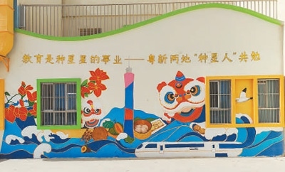 清晨,太陽剛剛升起,新疆伽師縣西克爾庫勒鎮(zhèn)中心幼兒園內(nèi),一群背著畫板、提著顏料箱的年輕人已開始忙碌。剛翻新的幼兒園墻面成為他們的畫布,大海與雪山、醒獅與烤馕、廣州塔與喀什高臺民居等粵新兩地文化元素在此相遇。百人共繪的畫卷(局部見圖),不僅點亮邊疆孩子們的藝術星空,也滋潤著共創(chuàng)者的心靈。