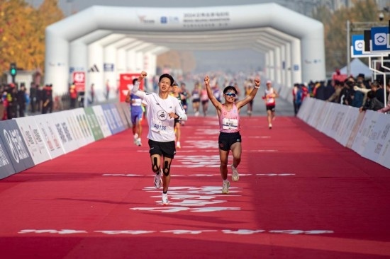 2024年11月3日,2024北京馬拉松賽暨全國馬拉松錦標(biāo)賽(第3站)在京舉行。參賽選手沖向位于奧林匹克公園的終點線。新華社記者 陳鐘昊攝
