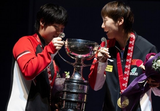 5月25日,冠軍中國(guó)組合王曼昱/蒯曼(左)在頒獎(jiǎng)儀式上。當(dāng)日,在卡塔爾多哈舉行的2025世界乒乓球錦標(biāo)賽女子雙打決賽中,中國(guó)組合王曼昱/蒯曼3比0戰(zhàn)勝波爾卡諾娃(奧地利)/斯佐科斯(羅馬尼亞)組合,奪得冠軍。新華社記者 肖藝九 攝